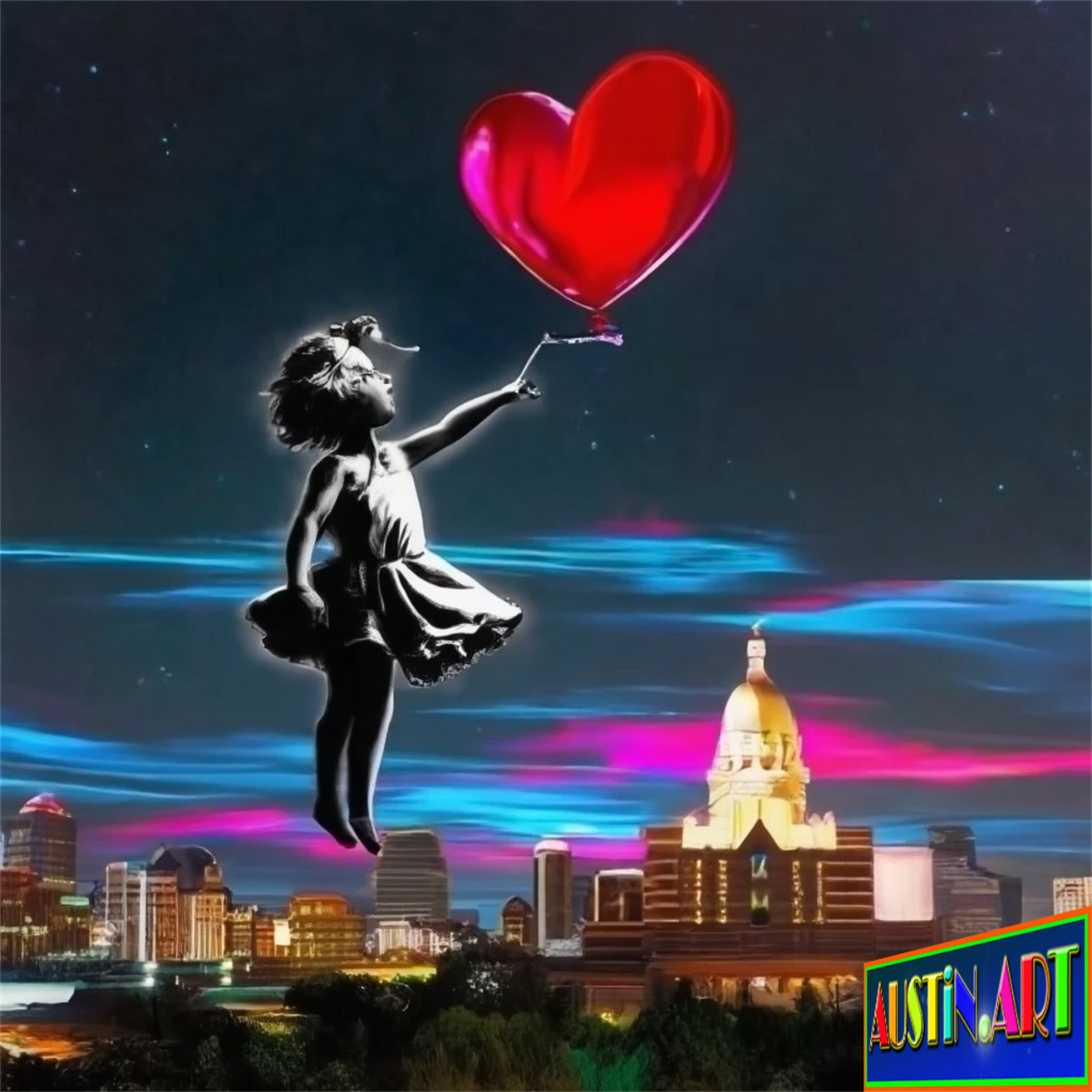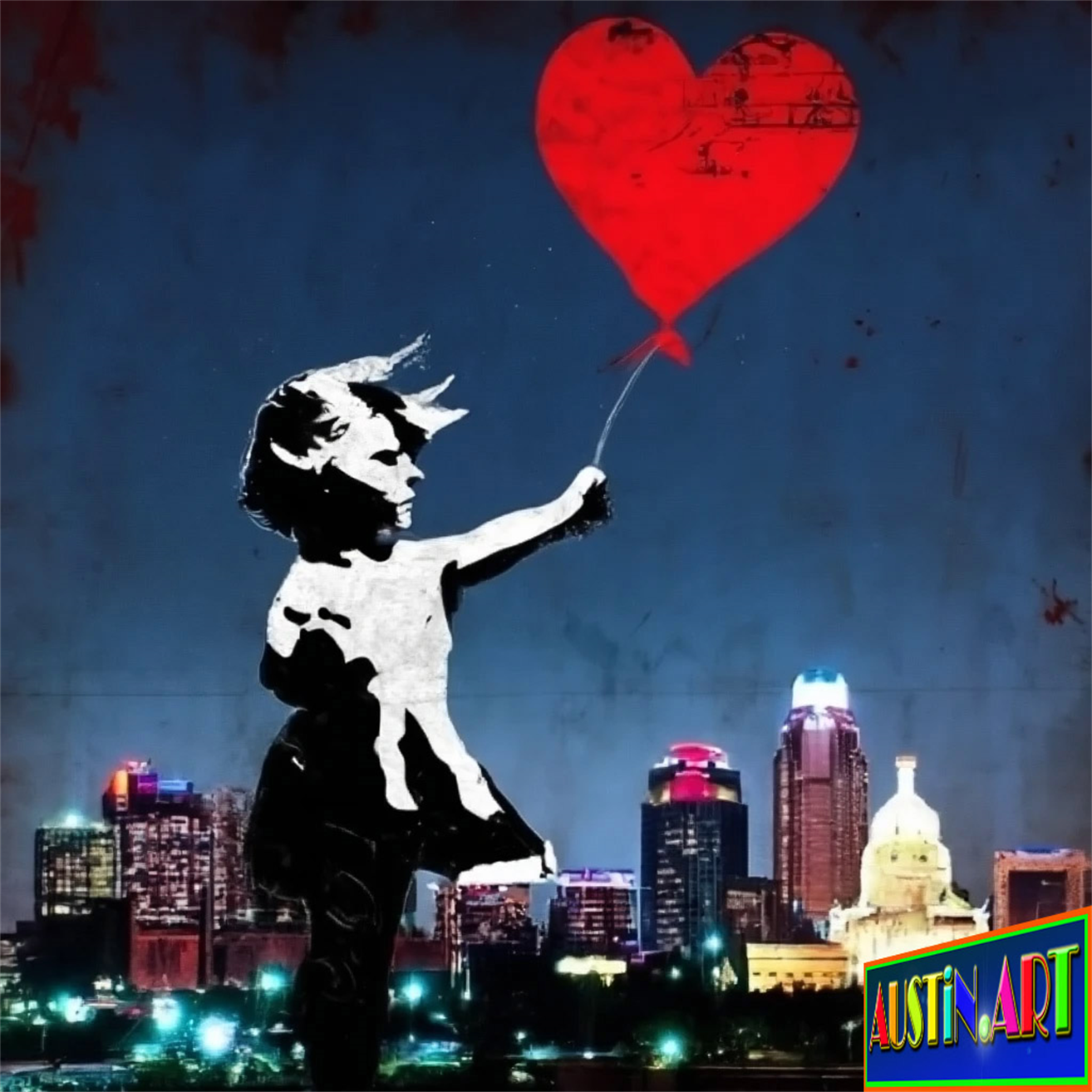 Banksy Art Style in Austin Texas Art Exhibition Created By Arte.Art Hold That Heart...And Fly Away! Artwork By Austin Artist DAPACU